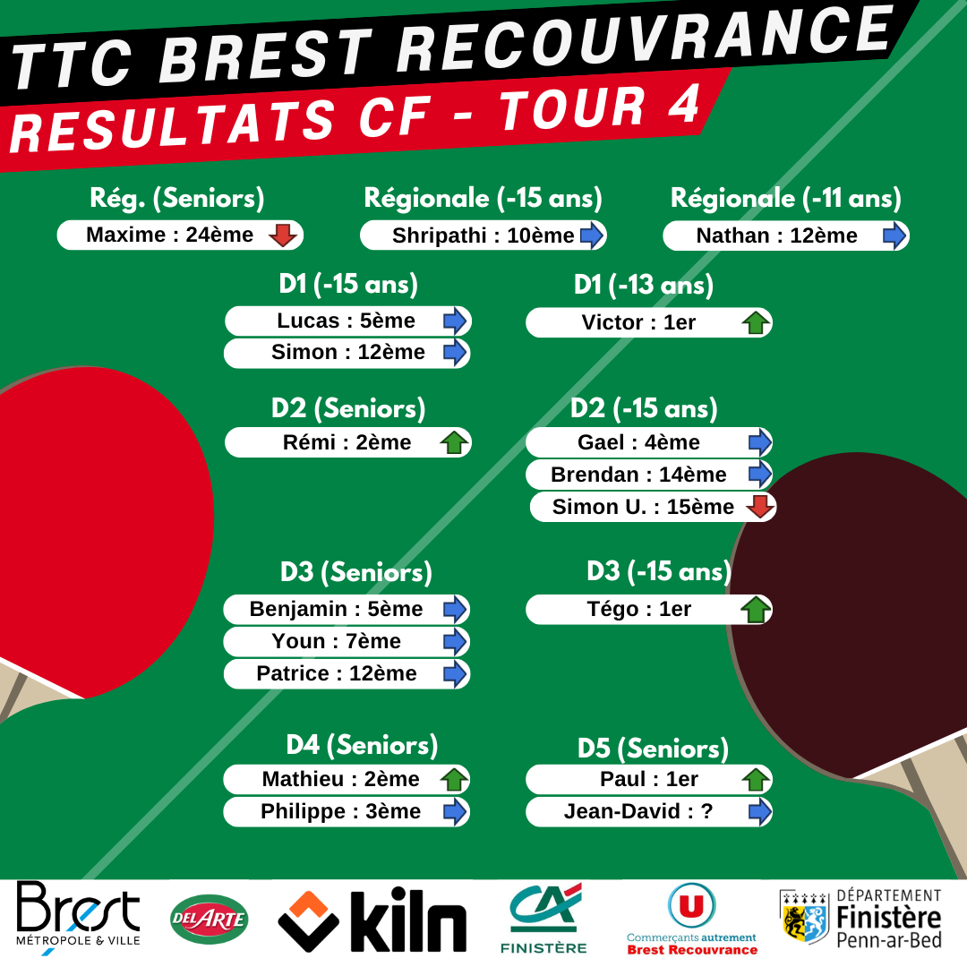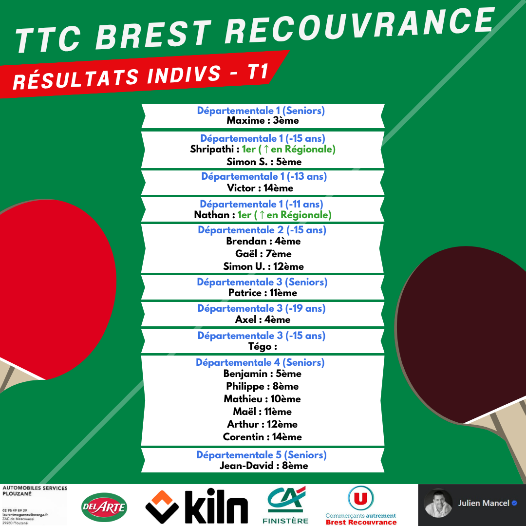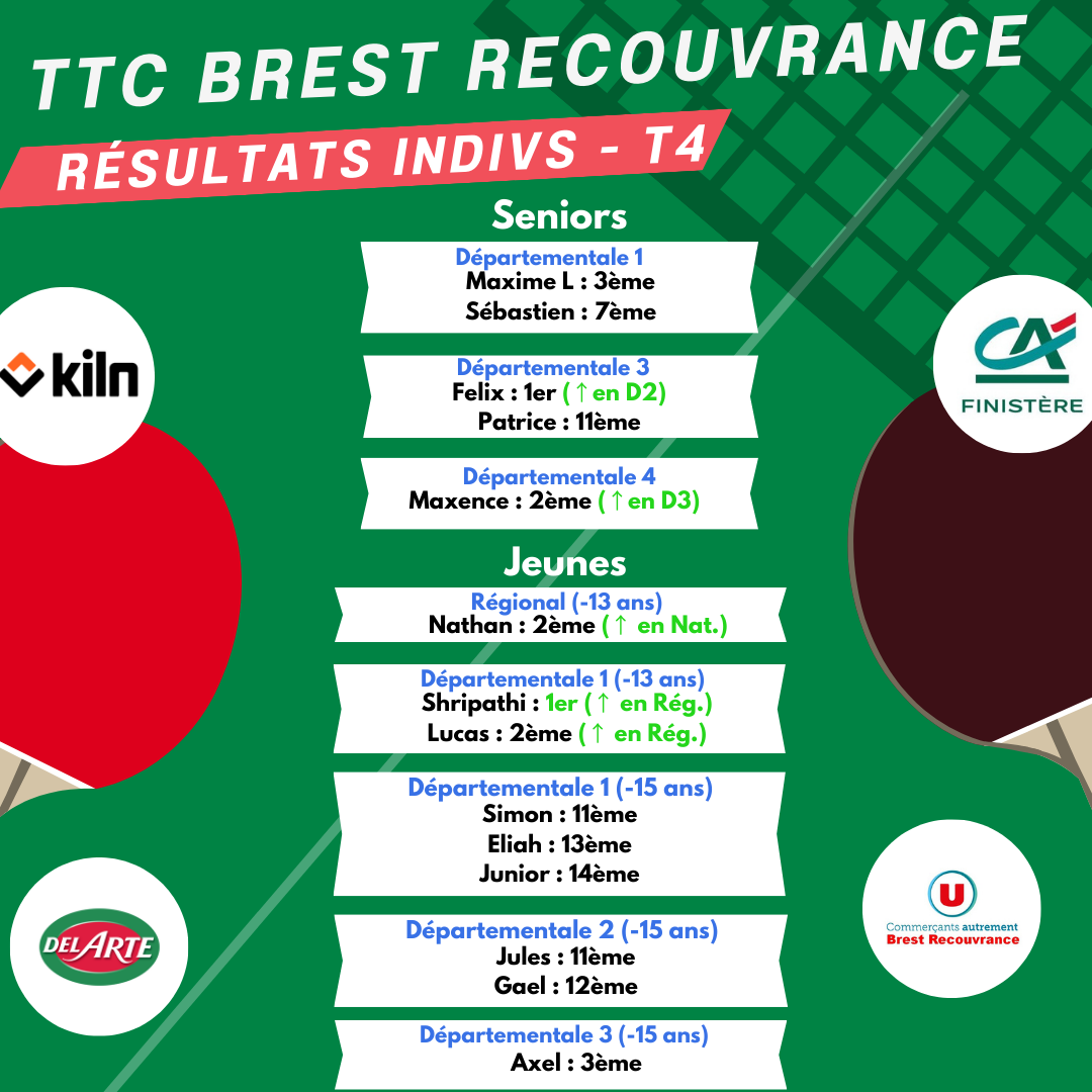 Le TTC Brest décroche 4 titres (Alex en -799, Quentin en Handisports debout, Loic et Katell en doubles mixtes, Albin et Jean-Philippe en doubles messieurs -1699)