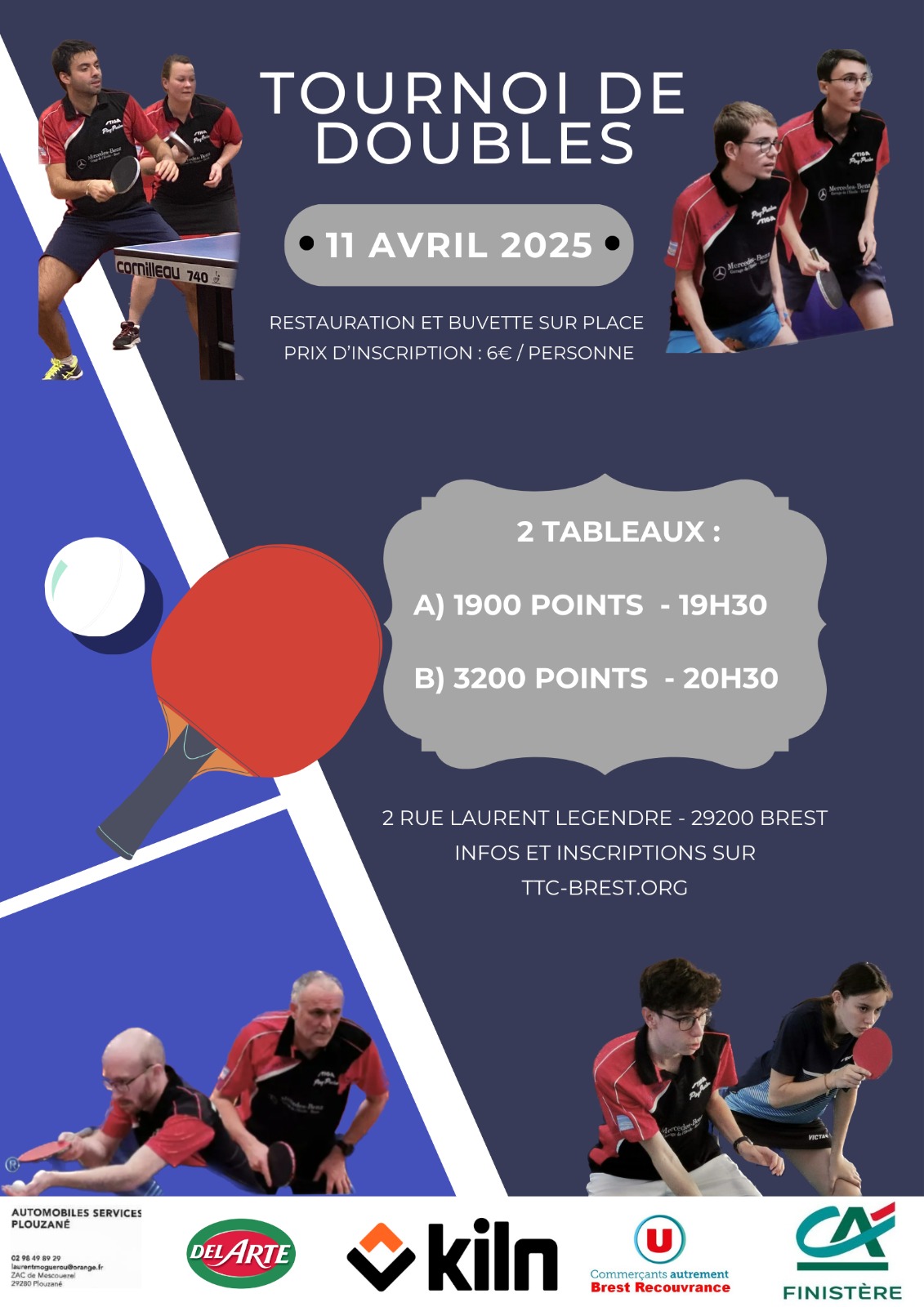 Le TTC BREST vous invite à participer le vendredi 24 avril 2026 à un tournoi de doubles (2 tableaux).